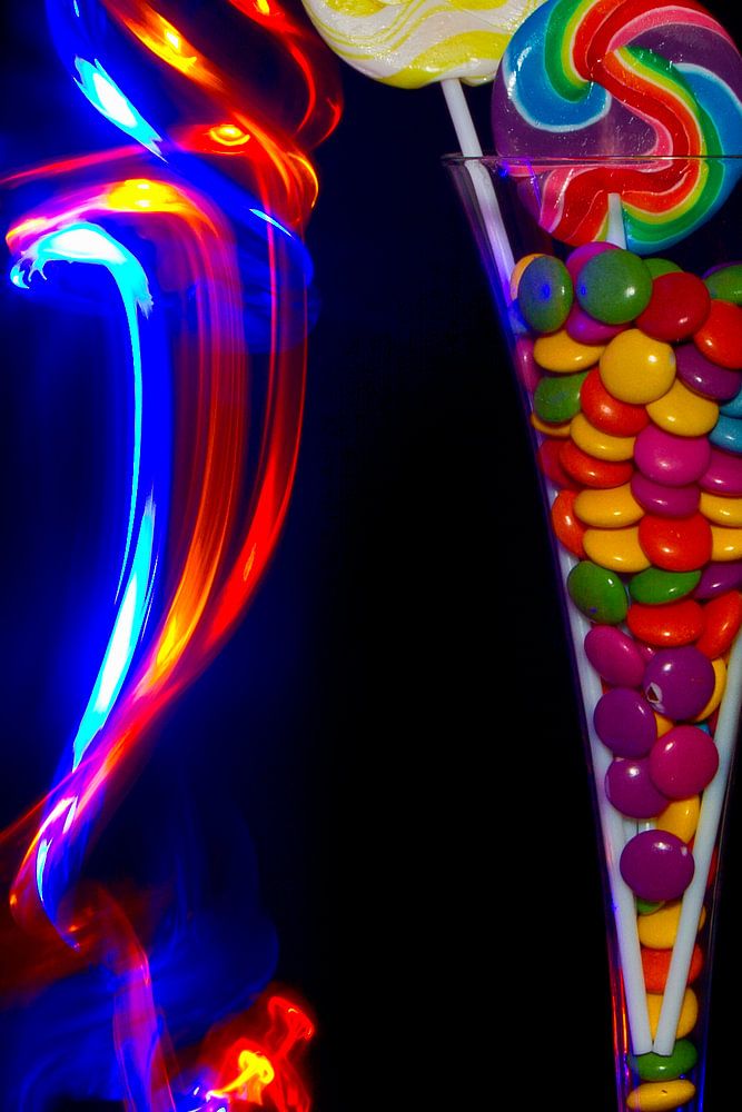 Feestelijke foto van een glas gevuld met smarties en daar 4 mooie kleurrijke lollies in gestoken. Op de achtergrond een mooi kader getekend met licht.