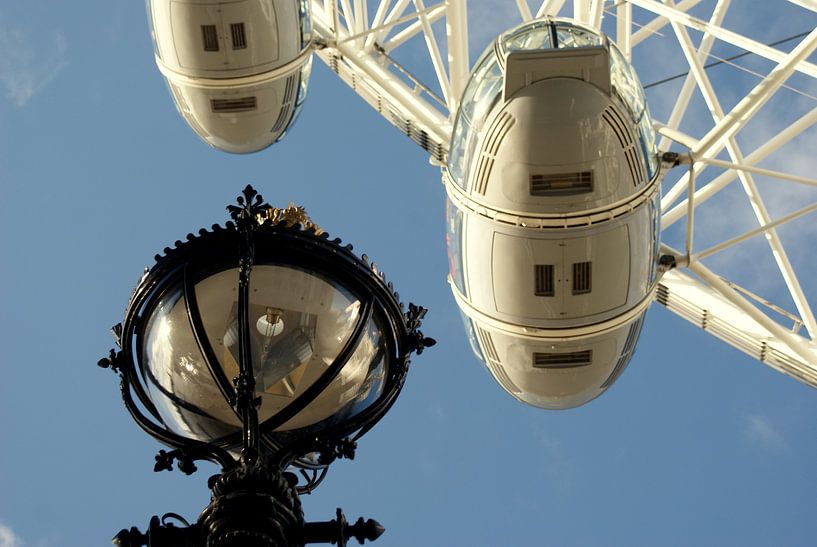 Een prachtig detail van de moderne gesloten capsule van de London Eye naast de fraai versierde straatlantaarn.