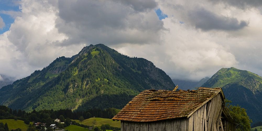 Alte marode Holzhütte, Lorettowiesen bei Oberstdorf, dahinter der Riefenkopf, 1750m, Allgäuer Alpen, Allgäu, Bayern, Deutschland, Europa