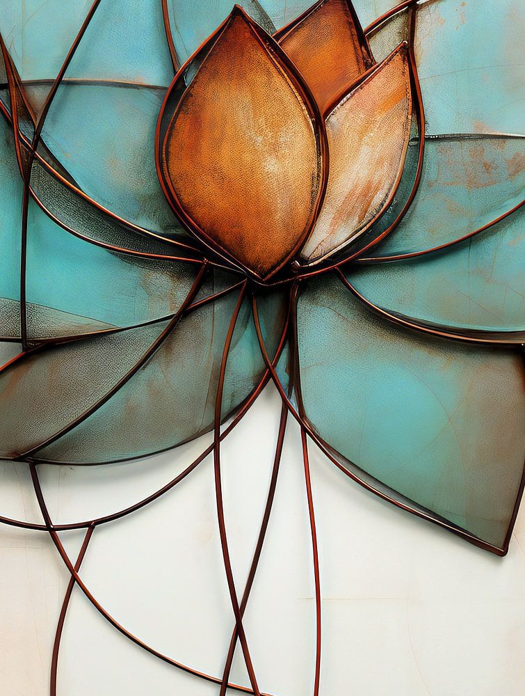Eine Lotosblume aus Eisendraht in Kupfer- und Türkistönen auf einem groben Papierhintergrund.