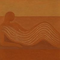 Dieses minimalistische abstrakte Ölgemälde lädt den Betrachter zu Stille und Fantasie ein. Warme Erdtöne und weiche, fließende Formen schaffen eine abstrakte Komposition, die Ruhe und Ausgeglichenheit ausstrahlt. Subtile weiße Nadelstreifen verleihen dem Werk eine spielerische Struktur und eine vielschichtige, fast poetische…