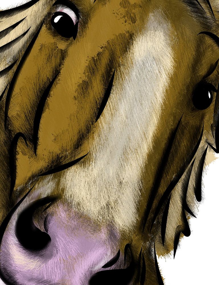Ein skurril gestyltes Pferd ist mit übertriebenen Gesichtszügen und einem ausdrucksstarken Gesicht abgebildet. Die Striche und Farben lassen auf eine spielerische und möglicherweise digitale Kreation schließen, wobei das Motiv den Betrachter neugierig anzuschauen scheint.