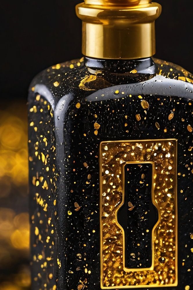 Dieses auffällige Foto zeigt einen luxuriösen Parfümflakon in tiefem Schwarz, der mit goldenen Details verziert ist und auf einer glänzenden schwarzen Oberfläche steht. Das Design strahlt durch die kontrastierenden Farben und die schimmernden goldenen Akzente, die den Flakon zieren, Eleganz und Raffinesse aus. Der goldene Verschluss und die raffinierten Texturen verleihen dem Ganzen einen Hauch von Exklusivität und Luxus. Das Spiel von Licht und Schatten verleiht Tiefe, während der goldene Bokeh-Hintergrund einen stimmungsvollen und glamourösen Effekt erzeugt. Diese Komposition ist perfekt für Liebhaber anspruchsvoller Ästhetik und setzt in jedem modernen Raum ein beeindruckendes visuelles Statement.