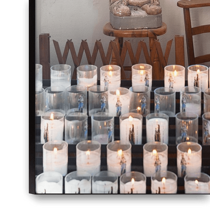 Madonna Maria sculptur in der Kapelle Notre Dame des Passes du Moulleau im kleinen französischen Fischerdorf L'Herbe in Cap Ferret mit Reihen von brennenden Kerzen in den Glasgefäßen im Vordergrund. Dieses Foto wurde im Sommer 2018 gemacht