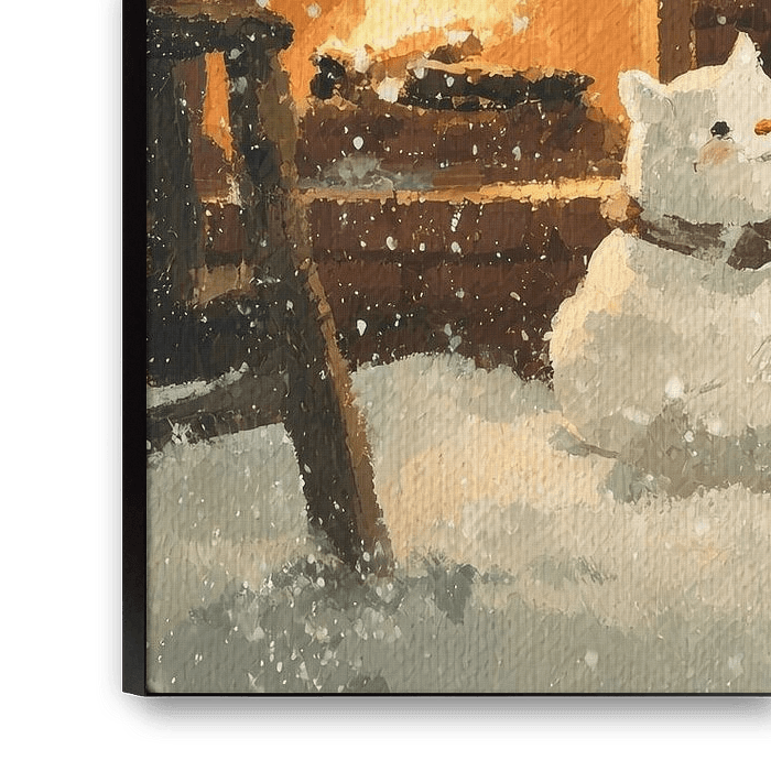 Ein Mädchen sitzt gemütlich auf einem dicken Schneeteppich in einem warmen, stimmungsvollen Raum, während die Schneeflocken sanft herabrieseln. Sie hält eine dampfende Tasse in der Hand und genießt sichtlich den beruhigenden Moment. Ihre rote Hose und ihr weicher Pullover bilden einen angenehmen Kontrast zu der winterlichen Umgebung. Neben ihr sitzen eine flauschige Katze und eine liebenswerte Schneekatze, beide mit Blick auf den knisternden Kamin, der die Szene mit einem goldenen Schein erwärmt. Dieses malerische Kunstwerk strahlt Ruhe, Gemütlichkeit und Winterzauber aus, perfekt für Liebhaber von Hygge, Winterkunst und gemütlichen Innenräumen.