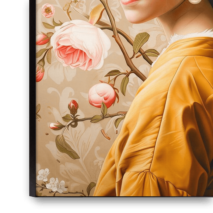 Es zeigt eine junge Frau in einem goldgelben Kleid mit einem detaillierten weißen Kragen, der eine reiche Textur aufweist. Ihr Gesicht ist von einem ruhigen und nachdenklichen Blick geprägt, und an ihrem…