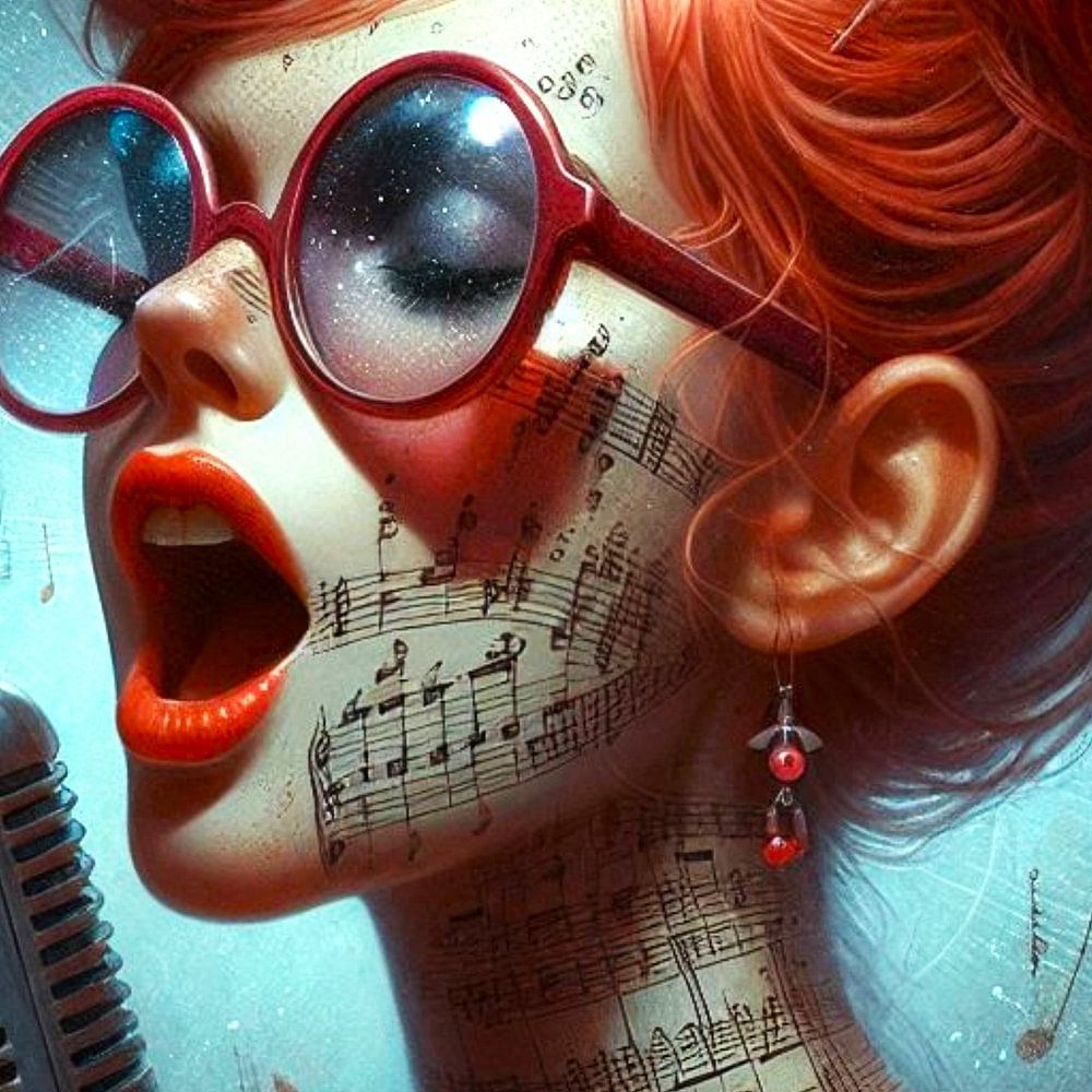 Dieses Porträt eines Mädchens mit roten Haaren, das eine Brille trägt, zeigt, dass sie mit Hingabe singt, was für eine Leidenschaft und Freude hier ausstrahlt, durch die musikalischen Noten, die über das Werk und über das Mädchen laufen, deutet ihre große Liebe zur Musik an, wie sie mit Hingabe in das Mikrofon singt, lässt keinen Zweifel. Dieses Mädchen liebt es zu singen. Man kann ihre schöne Stimme fast hören, wenn man sich dieses Werk ansieht. Ein Werk voller Leidenschaft und Hingabe. Es ist ein wunderbar surrealistisches Bild geworden, das an Ihrer Wand nicht fehl am Platz wirken wird.