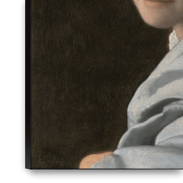 Vielleicht war eine von Vermeers älteren Töchtern ein Modell für die Leinwand. Das Mädchen ist keine klassische Schönheit, sondern hat ein breites und recht gewöhnliches Gesicht, das auch als "Mond" bezeichnet wird. Das blasse Gesicht bildet kaum einen Kontrast zu dem Seidenschal, in dem Vermeer erneut zeigt, wie er Lichteffekte auf glänzende Stoffe projizieren kann. Mit ihrem süßen Lächeln und interessierten Augen ruft das Mädchen ein Interaktionsgefühl beim Betrachter hervor, was Johannes Vermeer oft in seinen Bildern erzielt.