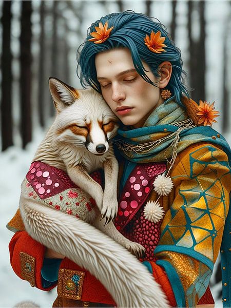 In einem verschneiten Wald hält ein junger Mann mit blaugrüner Haarpracht und farbenfroher, ornamentaler Kleidung einen schlafenden Fuchs eng an der Brust. Die Szene wirkt still und intim; die kühlen Töne des Hintergrunds kontrastieren mit warmen Orange- und Goldakzenten in Kleidung und Blumen, die das Bild wie ein leiser, kostbarer…