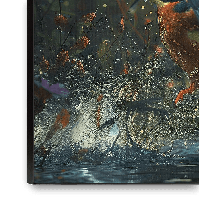 Bestelle dieses Vögel Wandbild Magischer Eisvogel mit Wassertropfen und rosa Blumen von Mel Digital Art als Reproduktion auf Leinwand, Alu-Dibond, als Poster, Fototapete, ArtFrame oder Acrylglasbild, maßgefertigt in höchster Qualität.