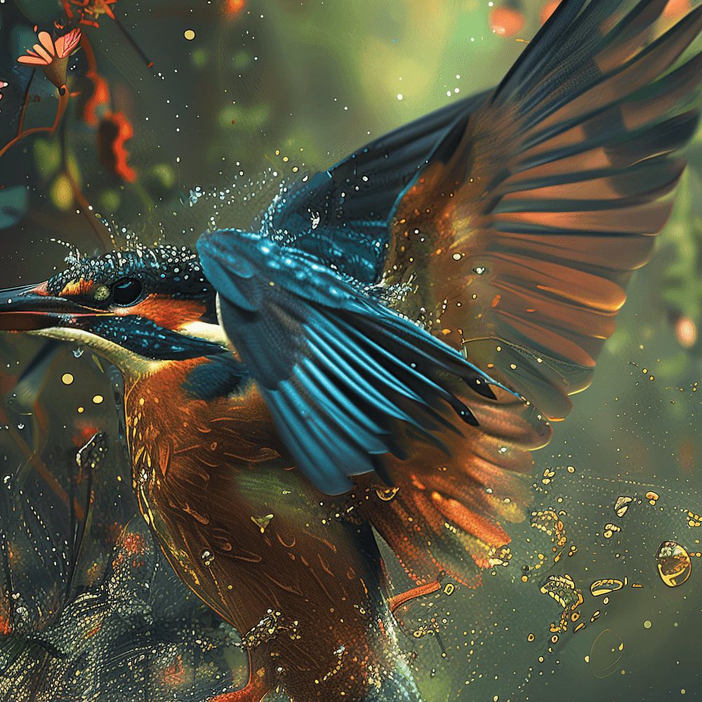 Dieser Eisvogel scheint direkt einem Märchen entsprungen zu sein. Der verträumte Hintergrund mit schönen Blumen und einer mystischen Atmosphäre runden das Bild ab. Genießen Sie die Details der Tropfen und das Überlaufen des Eisvogels im Hintergrund.