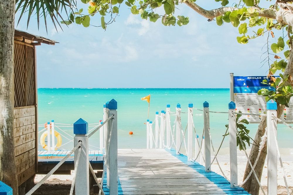 Magischer Weg, der zu einem wunderschönen Strand am karibischen Meer führt. Fotografiert im Jahr 2016.