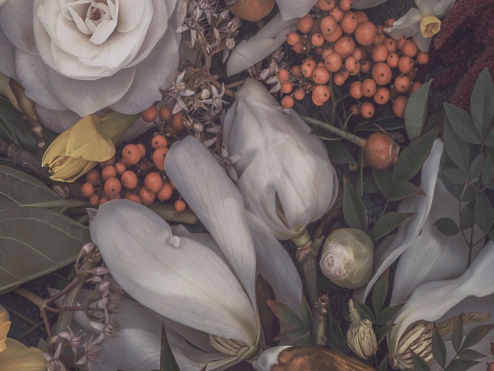 Verschiedene Magnolien und Kamelien auf einem dunkel strukturierten Hintergrund.