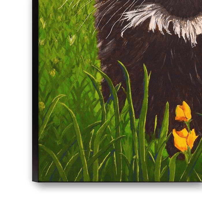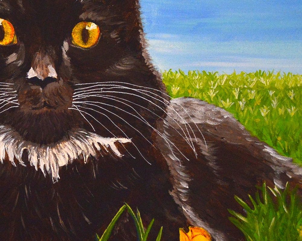 Gemälde einer Maine Coon im Gras mit gelben Blumen im Vordergrund und blauem Himmel im Hintergrund