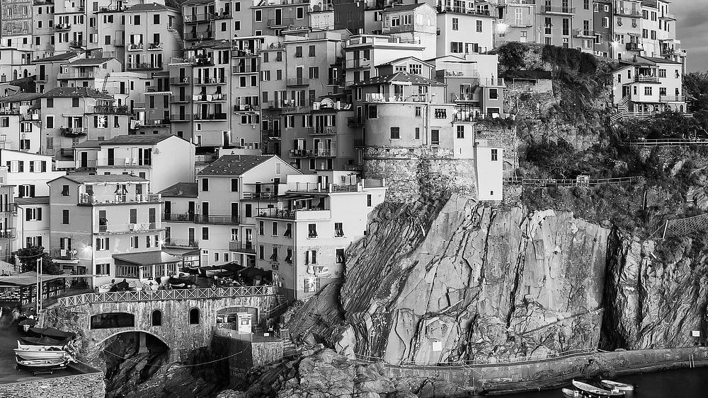 Eine Schwarz-Weiß-Fotografie eines Abends in Manarola, einer Stadt und Gemeinde in der Provinz La Spezia, Ligurien, im Nordwesten Italiens. Sie ist eine von fünf Städten in der Region Cinque Terre.