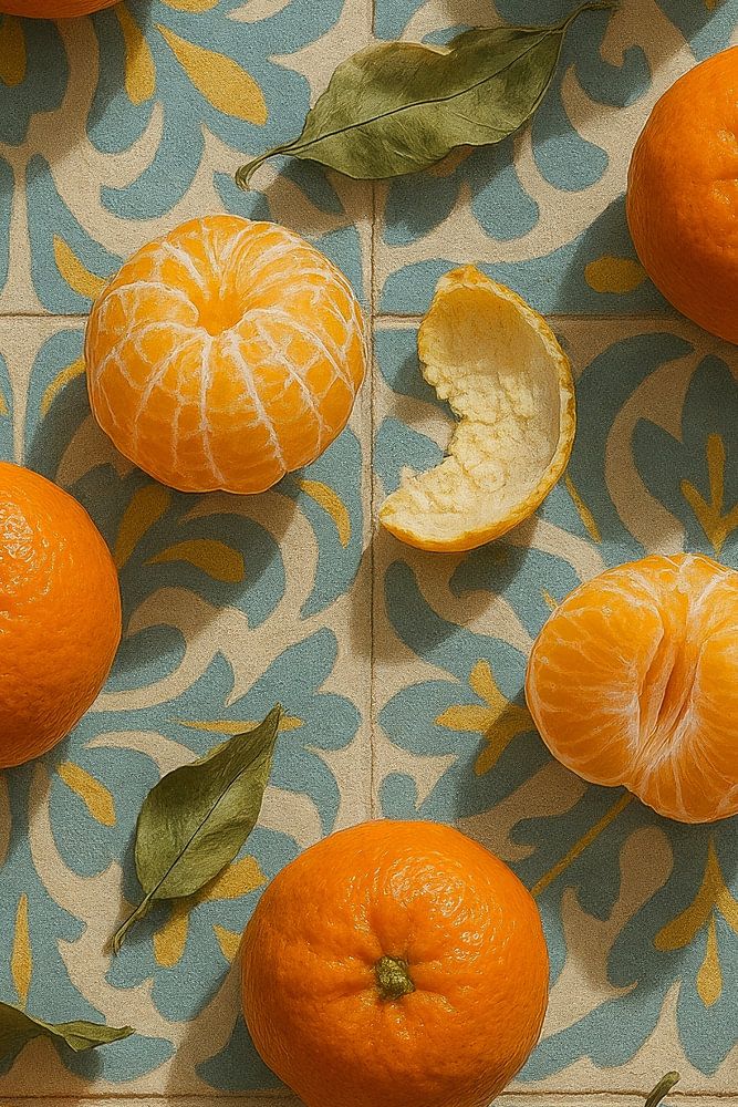 Ein verspieltes Stillleben aus Mandarinen und Schalen auf einem Hintergrund aus klassischen Vintage-Fliesen. Die warmen Orangetöne kontrastieren wunderbar mit dem blau-gelben Muster und bringen ein frisches mediterranes Gefühl in Ihr Interieur.