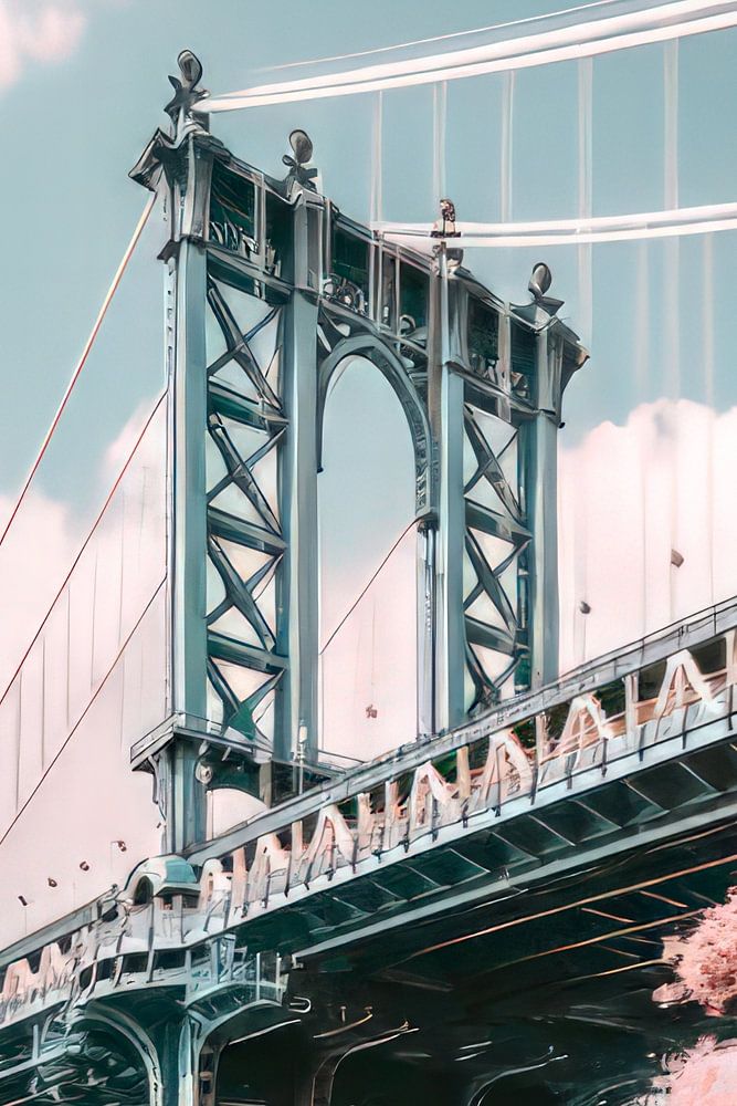 Digitale Pastellmalerei der Manhattan Bridge. Dieses wunderschöne Kunstwerk erweckt die ikonische Brücke auf einzigartige und verträumte Weise zum Leben. Die sanften Pastelltöne und die fließenden Linien vermitteln ein Gefühl der Gelassenheit und Ruhe. Das raffinierte Zusammenspiel der Farben und die sorgfältig gestalteten Details machen dieses Kunstwerk zu einer anspruchsvollen Ergänzung für jedes Interieur. Ganz gleich, ob Sie ein Liebhaber von Stadtlandschaften sind, die Manhattan Bridge bewundern oder einfach nur einen Hauch von Sanftheit in Ihren Raum bringen wollen, dieses pastellfarbene Digitalkunstwerk wird mit Sicherheit eine Atmosphäre von Magie und Wunder schaffen.