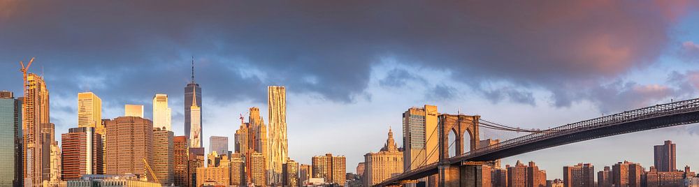 Sonnenaufgang in Manhattan gesehen von Brooklyn während eines kalten aber schönen Morgens in New York. Auf der rechten Seite sehen Sie die Brooklyn Bridge und die Manhattan Bridge.