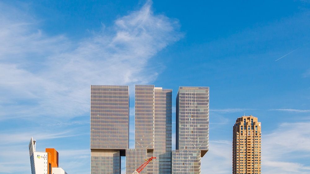 Während einer Schifffahrt auf der Maas mit einer köstlichen Dinner-Show an Bord konnte ich mehrere schöne Fotos von der Stadt Rotterdam machen. Dieses Foto wurde am frühen Abend aufgenommen, als ich gerade unter der Erasmusbrücke hindurchfuhr und alle Gebäude am Kop van Zuid im Bild waren. Und das vor einem herrlich sonnigen blauen Himmel im Hintergrund.