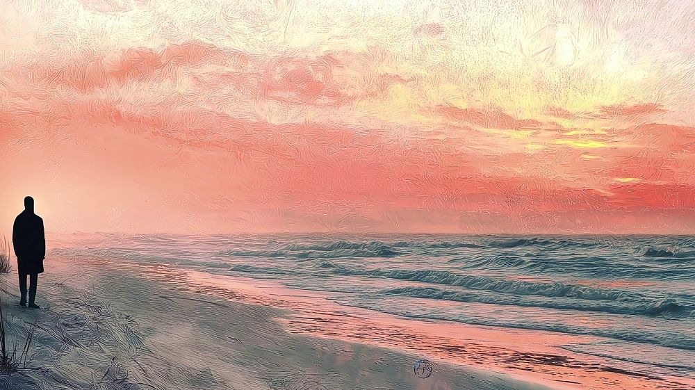 In diesem Bild ist ein Mann zu sehen, der gemächlich am Strand spazieren geht, während die Sonne langsam am Horizont untergeht. Der Himmel leuchtet in lebhaften Farben – von warmen Orangetönen bis hin zu sanften Violett- und Blautönen – und schafft eine atemberaubende Kulisse für diesen friedlichen Moment. Die sanften Wellen des Meeres reflektieren das Licht und tragen zur idyllischen Atmosphäre bei. Der Mann scheint in Gedanken versunken, während er die Schönheit der Natur um sich herum genießt. Dieses Bild fängt nicht nur die Ruhe eines Abendspaziergangs ein, sondern vermittelt auch ein Gefühl von Freiheit und Entspannung inmitten der beeindruckenden Kulisse eines Sonnenuntergangs.