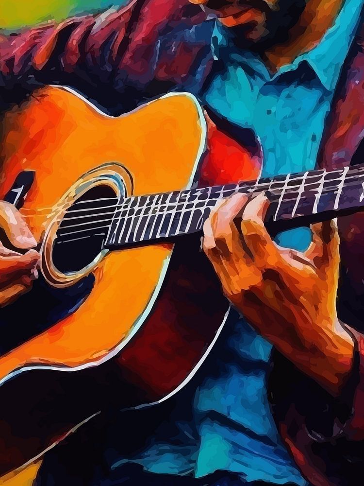 Auf diesem ausdrucksstarken Gemälde sitzt ein Mann vertieft in den gefühlvollen Akt des Gitarrenspiels. Seine Finger gleiten mühelos über die Saiten, wobei jeder Ton die Luft mit unsichtbarer Harmonie formt. Der Hintergrund fließt in warmen, sonnengeküssten Farbtönen und strukturierten Pinselstrichen, die die Intimität eines von Sonnenuntergang beleuchteten Studios heraufbeschwören. Seine Haltung zeugt von Bequemlichkeit und stundenlangem Üben, während sein Blick im Rhythmus versunken bleibt. Dieses Werk lädt den Betrachter in eine Welt der Kreativität und Einsamkeit ein, in der Musik zu einer Sprache der Gefühle wird. Dieses Kunstwerk eignet sich ideal für Räume, in denen der Selbstausdruck zelebriert wird, und verleiht jedem Raum ein Gefühl von Wärme und künstlerischer Seele.