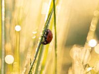 Völlig bedeckt mit Tautropfen an diesem Morgen. Die Natur erwacht. Das Licht bildet zusammen mit den Tropfen ein schönes Bokeh.