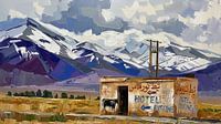 Dieses ausdrucksstarke Ölgemälde fängt den faszinierenden Kontrast zwischen menschlicher Vergänglichkeit und der ewigen Monumentalität der Natur ein. Im Vordergrund steht eine einsame, verlassene Hütte am Rande einer Landstraße in Marokko, deren Wände mit charmanten, handgemalten Wegweisern zu einem fernen „Hotel“ und „Piscine“…