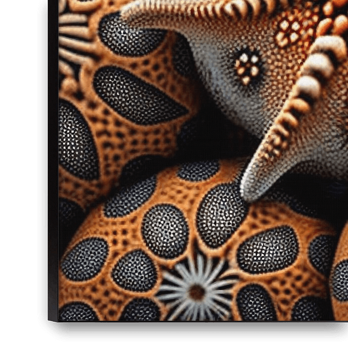 Meeresrelikte präsentiert eine faszinierende Ansammlung von Formen, die von Seeigeln inspiriert sind und jeweils mit komplexen Texturen und feinen Oberflächendetails verziert sind. Eine zentrale sternförmige Struktur bildet den Mittelpunkt der Komposition, umgeben von kugelförmigen Elementen in warmen Erdtönen von Orange und Braun.…
