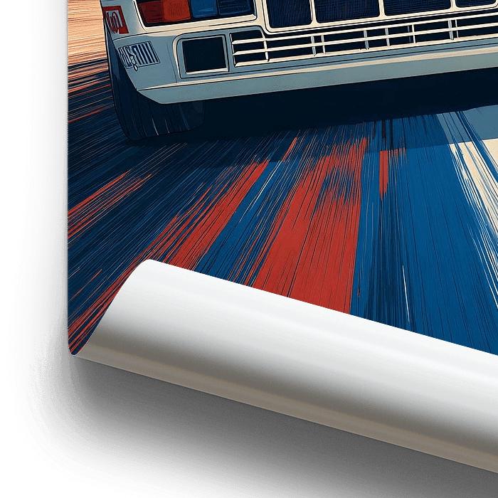 Ein dynamisches Retro-Werbeposter zeigt einen frontal heranrasenden Lancia Delta Integrale im ikonischen Martini Racing-Design. Die Perspektive ist tief und aggressiv, die Linien des Hintergrunds in Rot, Weiß und Blau ziehen wie Geschwindigkeitsspuren nach hinten. Über dem Fahrzeug steht groß „MARTINI“, was die Markenpräsenz verstärkt.…