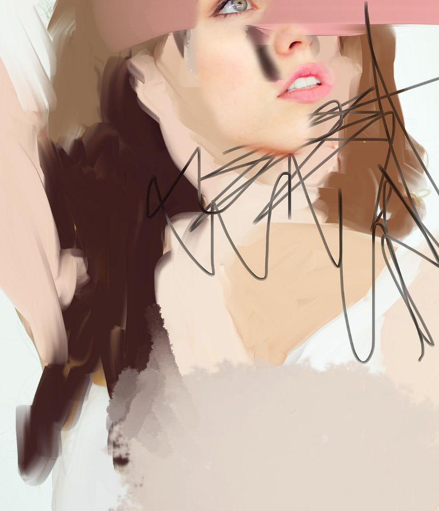 Abstraktes Porträt. Kombination von Fotografie, Acrylfarbe, Bleistift. Digital manipuliert.