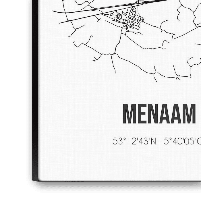 Schwarz-weiße Karte, Straßenkarte oder Straßenplan von Menaam. Menaam befindet sich in der Gemeinde Waadhoeke, Provinz Fryslan. Auf dem Stadtplan sind alle öffentlichen Straßen in Menaam eingezeichnet. Außerdem ist die Karte mit den Koordinaten des Zentrums von Menaam versehen.