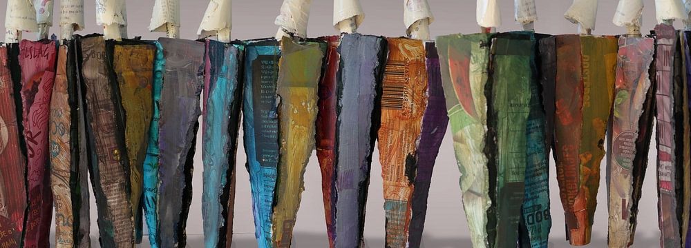 Abstrakte Darstellung einer Gruppe von Menschen in bunter Kleidung. Die menschlichen Figuren sind dreidimensional aus Verpackungskarton konstruiert, der mit einer transparenten Farbschicht überzogen ist. Der neutrale graue Hintergrund erzeugt einen modernen Effekt, der im Kontrast zu den bunten zerrissenen Schnipseln steht, aus denen das Werk besteht.