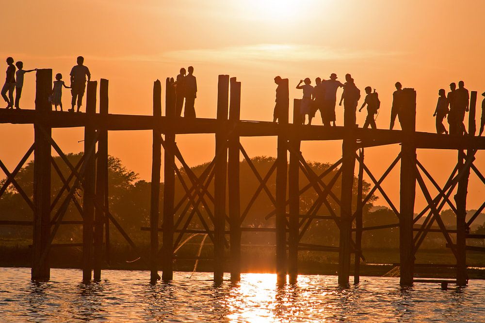 Mensen wandelen op de U Bein brug bij zonsondergang in Mandalay Myanmar