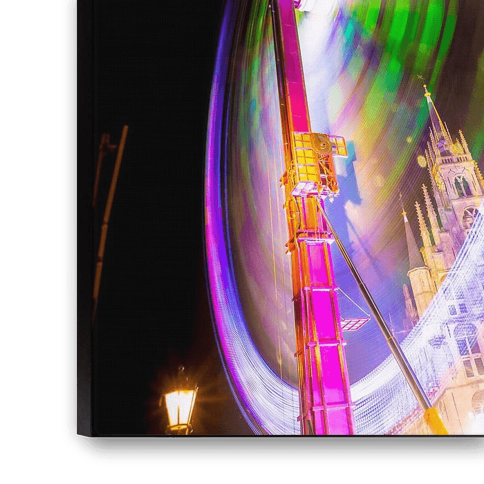 Abendaufnahme einer sich drehenden Jahrmarktsattraktion mit langer Belichtungszeit. Im Hintergrund das historische mittelalterliche Rathaus von Gouda.