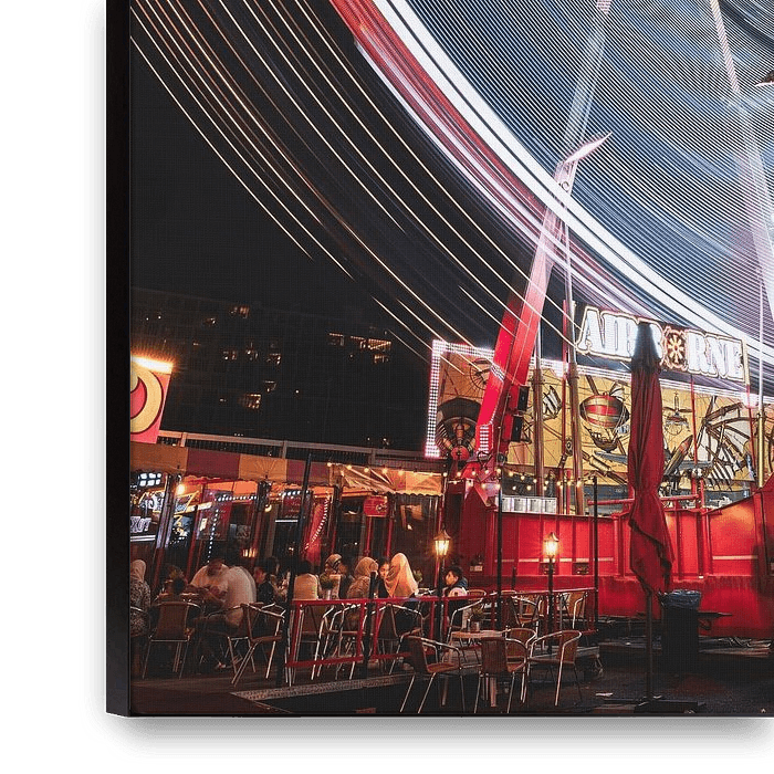 Schönes, farbenfrohes Bild wegen der Lichter auf dem Rad, das sich in schnellem Tempo drehte. Die langsame Verschlusszeit verleiht dem Bild einen schönen Effekt. Alles, was stillsteht, ist scharf.
