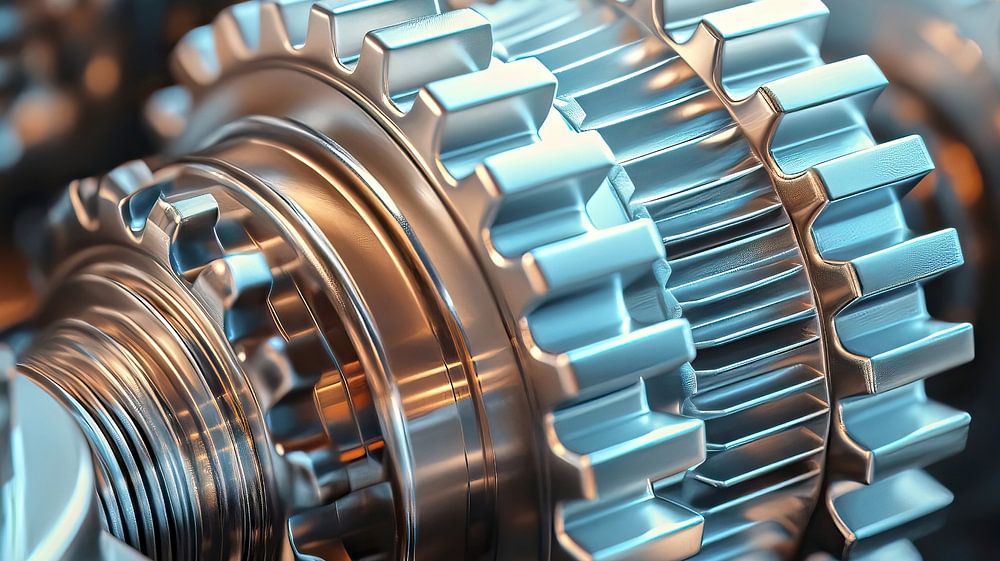 Diese Nahaufnahme zeigt ineinandergreifende Metallzahnräder und Maschinenkomponenten mit einem futuristischen Flair. Die präzisen Details und die glänzende Oberfläche der Metallteile verleihen der Szene eine technologische Ästhetik, während das Zusammenspiel der Zahnräder und Komponenten eine Atmosphäre von Bewegung und Fortschritt vermittelt. Die futuristische Ausstrahlung der Szene regt die Vorstellungskraft an und lässt den Betrachter über Technologie, Innovation und die Zukunft der Industrie nachdenken.