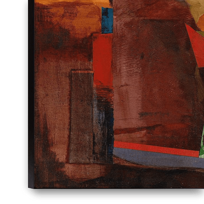 Eine dynamische Komposition, die eine Reihe von Formen in satten, erdigen Tönen und lebendigen Akzenten aufweist. Die abstrakte Collage verwendet eine harmonische Mischung aus Rot-, Blau- und Grüntönen vor einem gedämpften, neutraleren Hintergrund in Braun- und Beigetönen. Für dieses Mixed Media Werk wurden mit Acrylfarbe bemalte und…