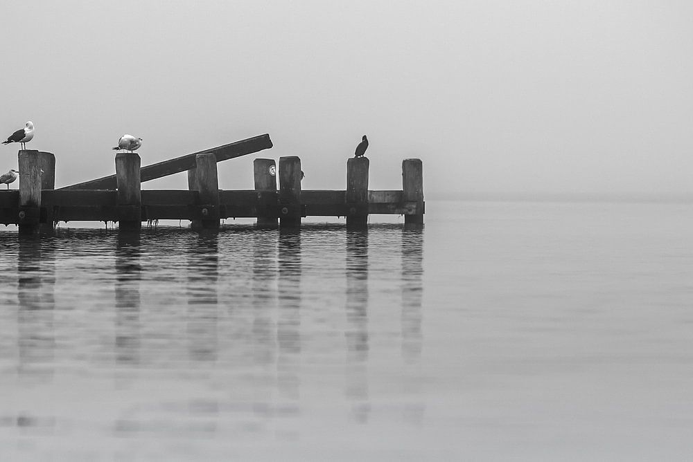 eingeschränkte Sicht auf einen maroden Steg am Strand von Travemünde. Versammlungs- und Schlafplatz vieler Seevögel.