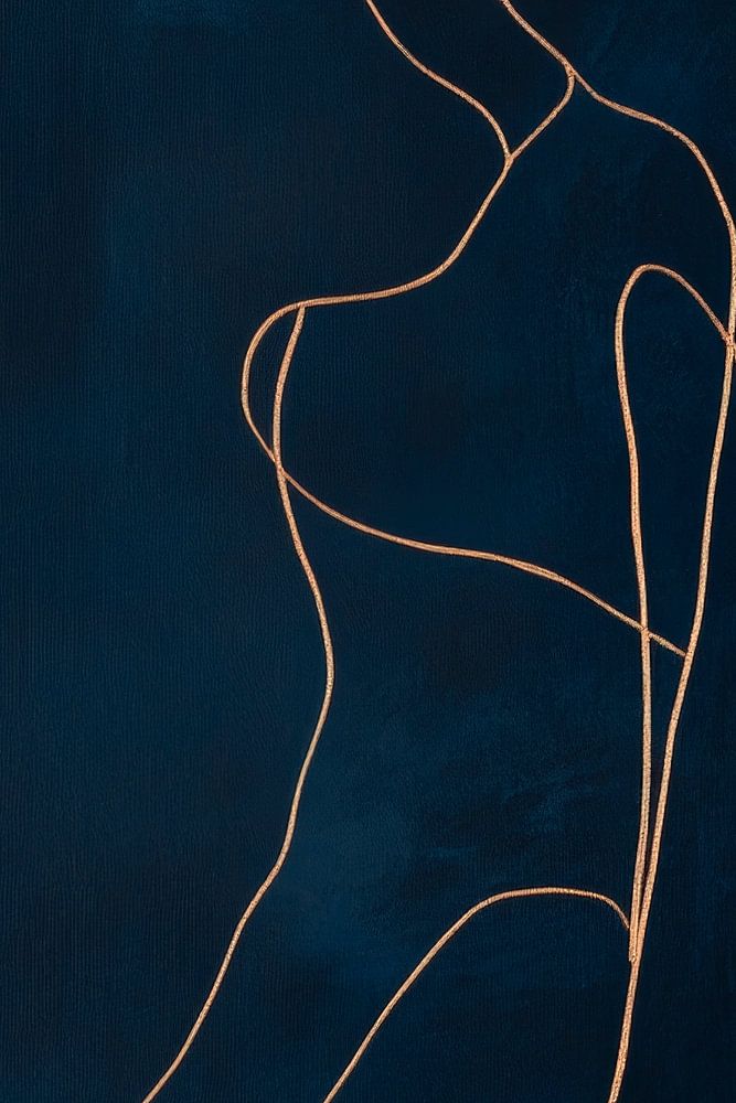 Ein stilvolles, minimalistisches Kunstwerk, das die elegante Silhouette einer sitzenden Figur in sanften, fließenden Linien einfängt. Der tiefblaue Hintergrund verstärkt die moderne Ästhetik, während die goldbraunen Konturen Wärme und Anmut ausstrahlen. Perfekt für ein Schlafzimmer oder ein gemütliches Wohnzimmer, um eine einladende und entspannte Atmosphäre zu schaffen.