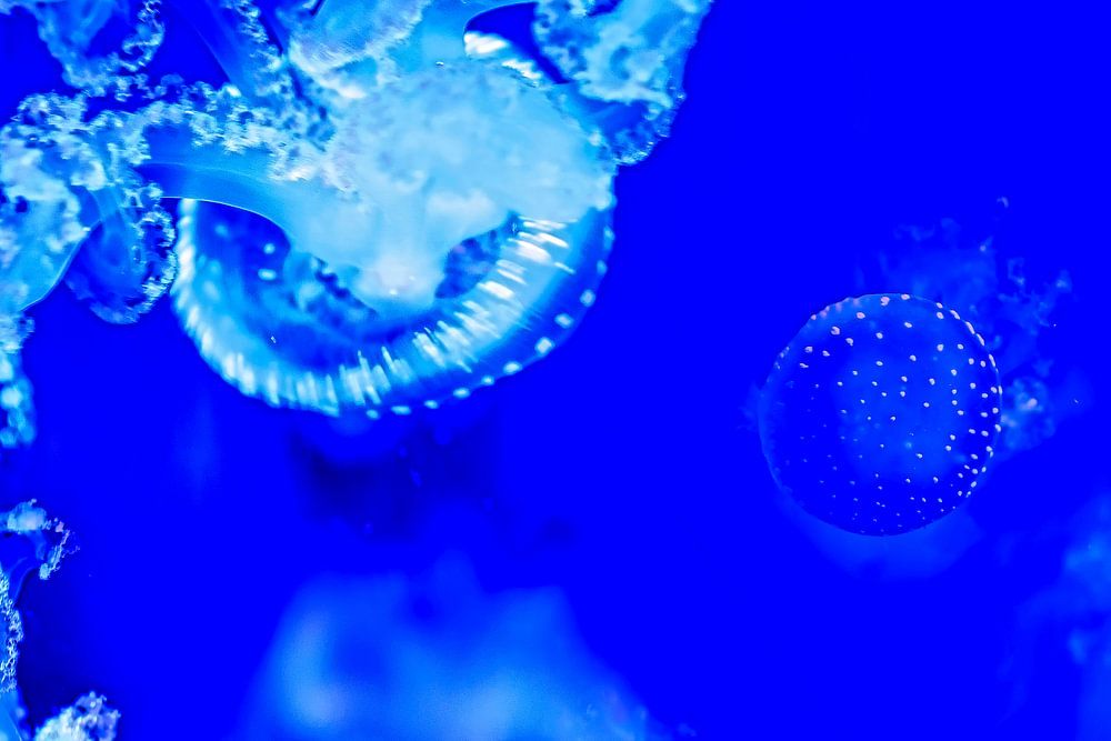 Mit dem Fluss, schwimmende Quallen. Quallen auf blauem Hintergrund. Eine Qualle schwebt sozusagen im Wasser, sie lässt sich mitreißen, sie ist ein passives Höhlentier. Eine Qualle besteht zu 98% aus Wasser.