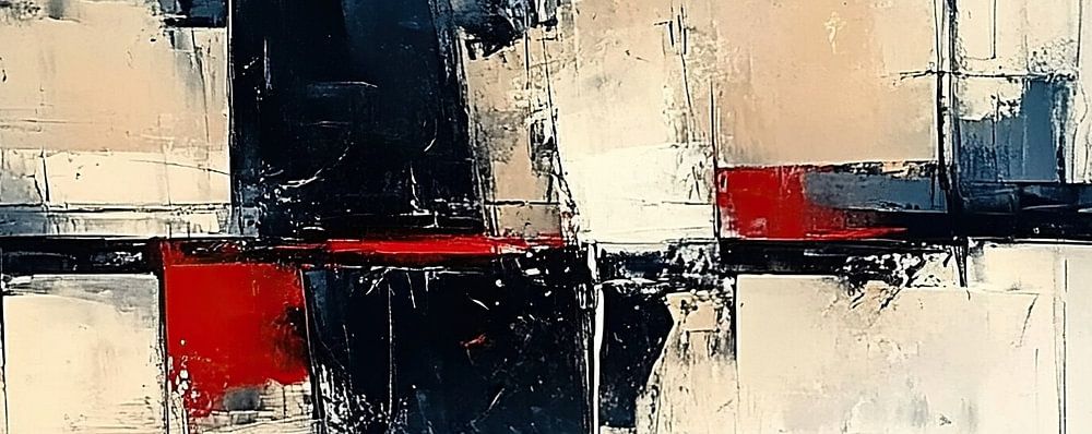 Modern Art | Red Stripe - Dieses abstrakte Gemälde zeigt eine Harmonie von Grau und Weiß mit kräftigen horizontalen und vertikalen Linien, die von leuchtenden roten und schwarzen Streifen durchschnitten werden, die ein Gefühl von Ruhe und Reflexion ausstrahlen.