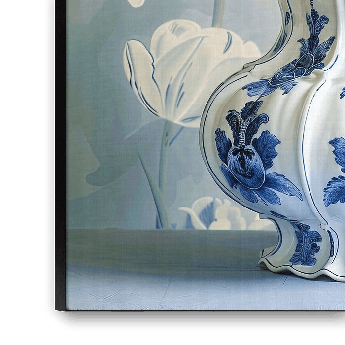 Dieses Kunstwerk verbindet klassische Eleganz mit einem frischen und modernen Look. Die Tulpen in leuchtenden Rot- und Weißtönen fallen sofort ins Auge und werden wunderschön von einer traditionellen Vase in Delfter Blau eingerahmt. Die dekorativen Blumenmotive und der gewellte Rand der Vase sorgen für ein verspieltes Element, während der dunkle Hintergrund eine kraftvolle und zeitlose Komposition schafft. Dieses Werk strahlt Handwerkskunst und Kreativität aus und ist perfekt für Kunst-, Blumen- und Naturliebhaber.