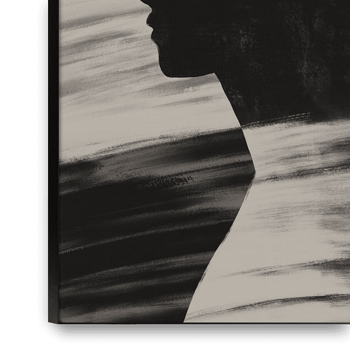 Dieses Gemälde zeigt in Schwarz-Weiß eine gemalte Frau mit hochgestecktem Haar. Es ist in einem minimalistischen, modernen und abstrakten Stil gemalt.