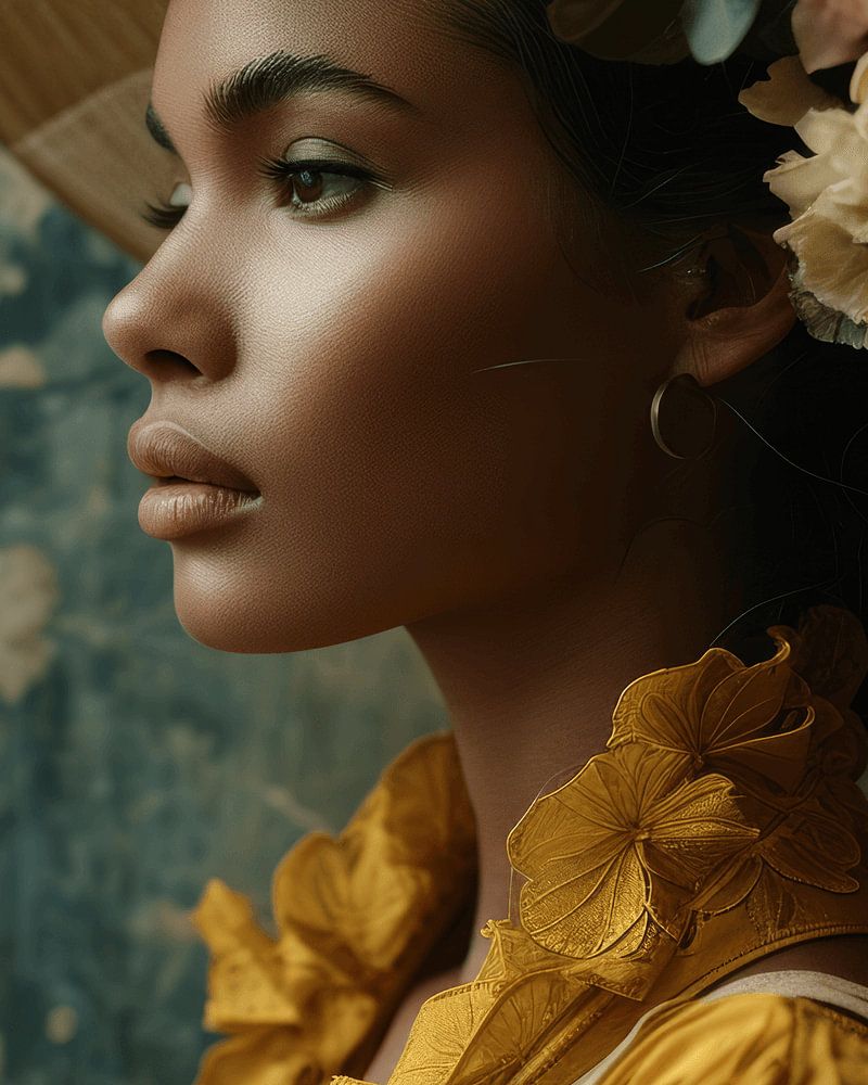 Modernes und schickes Porträt einer jungen Frau mit Blumen im Haar. Wählen Sie Ihre eigene Größe und Material für diese Arbeit und machen Sie es zu einem echten Blickfang.