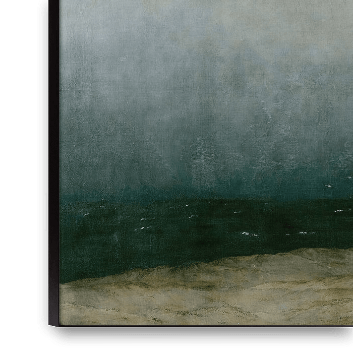 Zwei Jahre lang arbeitete Friedrich an diesem, seinem letztlich berühmtesten Werk. Die Komposition ist horizontal in Land, Meer und Himmel unterteilt, und zwar in einer klaren Einfachheit, die seine Zeitgenossen schockierte. Ein Mönch steht mit nacktem Oberkörper am Ufer. Möwen umkreisen ihn. Die einsame Gestalt blickt in die bleierne Schwärze des unermesslich weiten Meeres. Das graue Wolkenband über dem Wasser weicht am oberen Bildrand überraschenderweise einem blauen Himmel. Noch nie war eine künstlerische Komposition so kompromisslos wie diese: Der Hauptraum des Bildes wirkt wie eine Art Abgrund, es gibt keine Grenzen, nichts zum Festhalten, nur ein Gefühl des Schwebens zwischen Nacht und Tag, zwischen Verzweiflung und Hoffnung.