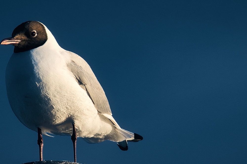 Möwen auf einer Buhne in Zingst an der Ostsee, die ins Meer reichen. Wildvögel an der Küste.