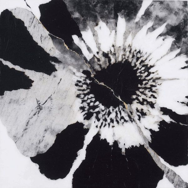 Eine Makro-Abstraktion des Zentrums einer Mohnblume'. Kräftige, schwarze Blütenblätter strahlen von einem dunklen, strukturierten Kern aus, der von einer zarten goldenen Ader durchzogen ist, die der organischen Form eine raffinierte Note verleiht.