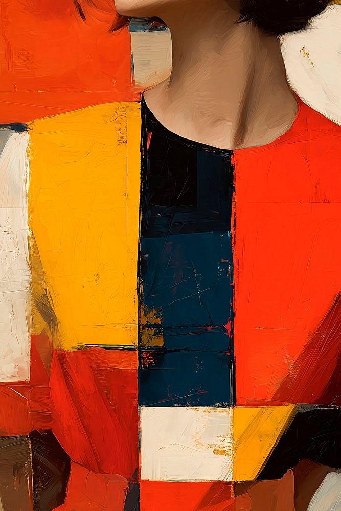 Ein geometrisches Kubismus-Kunstwerk einer Frau in einem eleganten Kleid mit Farbflächen, die von Piet Mondrians abstrakten Kompositionen inspiriert sind. Der
