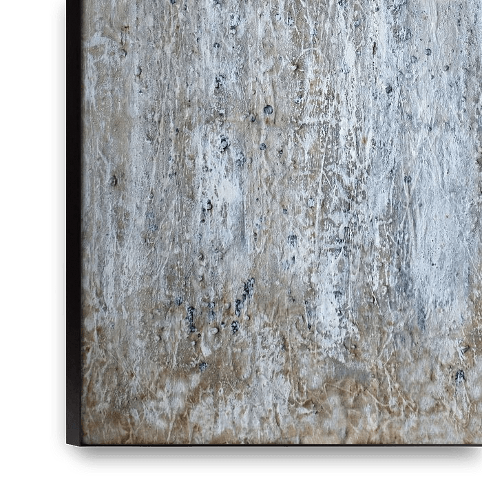In abstrakter Darstellung zeitgenössischer Kunst zerfließt milchige Farbe und sorgt für eine blass-weiße Darstellung auf einer rauen Oberfläche. Die reduzierte Farbigkeit in Braun und Weiß in senkrechter Ausrichtung resultiert in einem sandigen, realistisch-authentischen optischen Effekt. (elha)