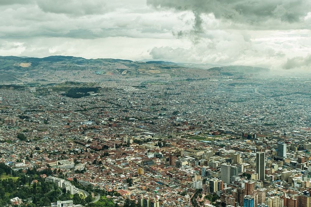 Foto der Millionenmetropole Bogota in Kolumbien, linke Seite, aufgenommen vom Berg Monserrate, auf den man mit einer 45-Grad-Seilbahn hinauffahren kann, um diesen Blick auf diese riesige Stadt zu genießen. Dunkle Wolken über uns - in diesem Klima kann das Wetter jeden Moment umschlagen.